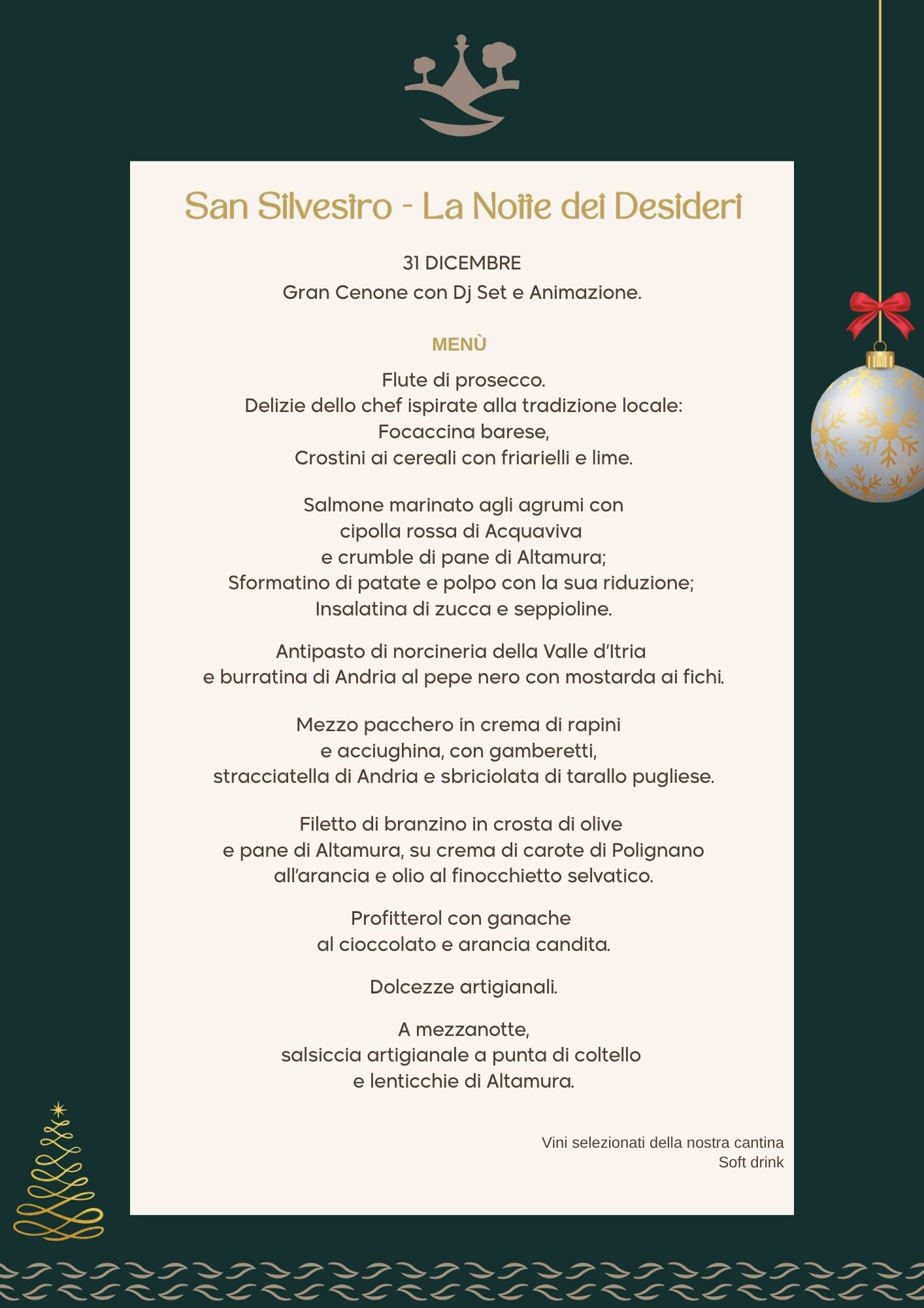 Cena, musica e balli si fondono in un crescendo di emozioni, culminando nel brindisi di mezzanotte, per celebrare insieme l’arrivo del nuovo anno con gioia e allegria.